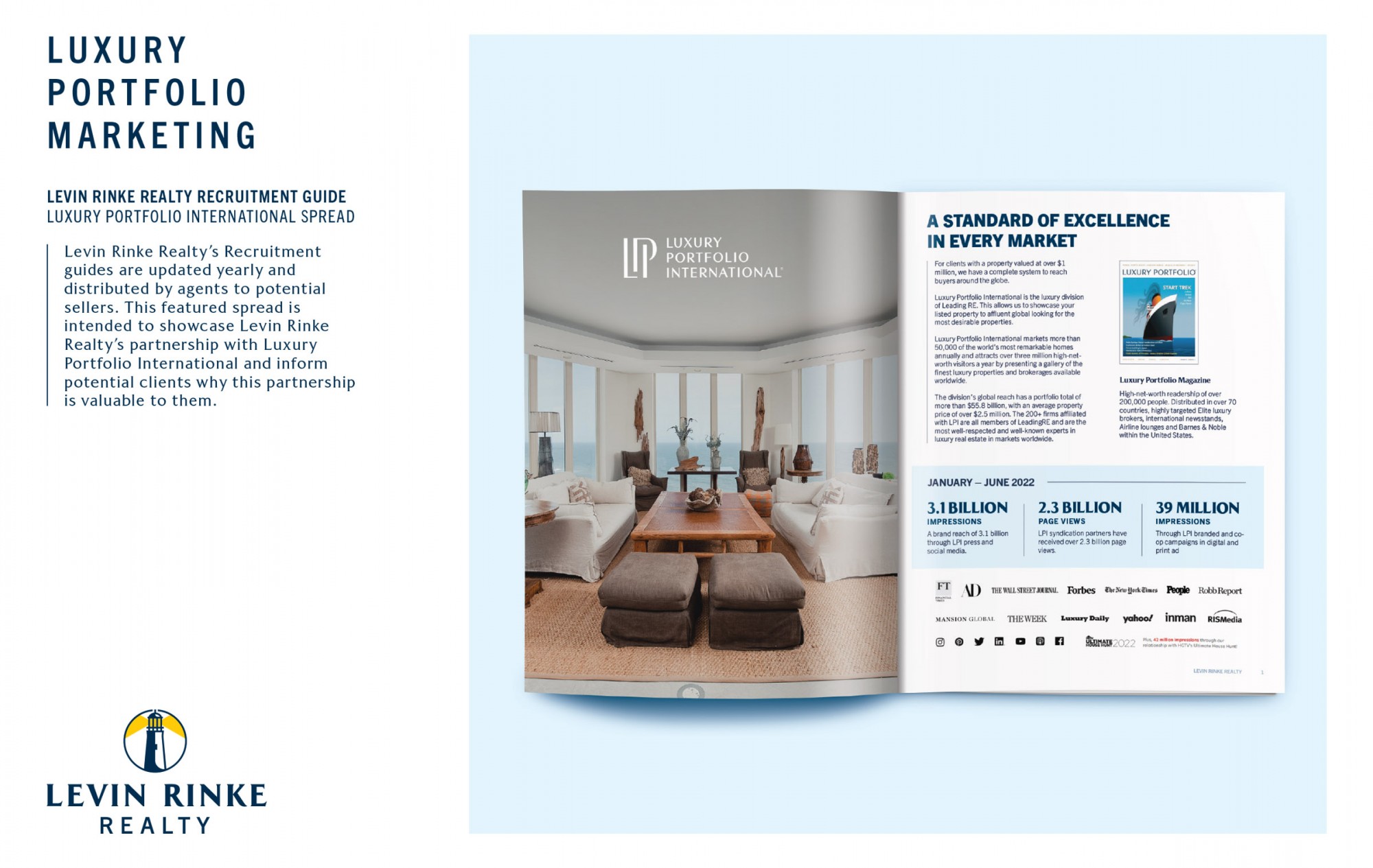 Levin Rinke Realty received the award for Luxury Portfolio Marketing, signifying excellence in luxury real estate marketing and exemplary incorporation of the Luxury Portfolio International® brand.